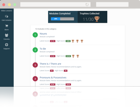 Each time you take the test for a certain lesson, your score is recorded in a chart so you can track your progress in each topic through time. Our goal is to help you achieve 100% on every test by giving you detailed feedback on your test results.