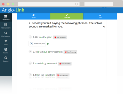 To assist you, you can listen to the teacher's recording of the word or the phrase several times before you try it yourself. You also have the option to listen to your own recoding.